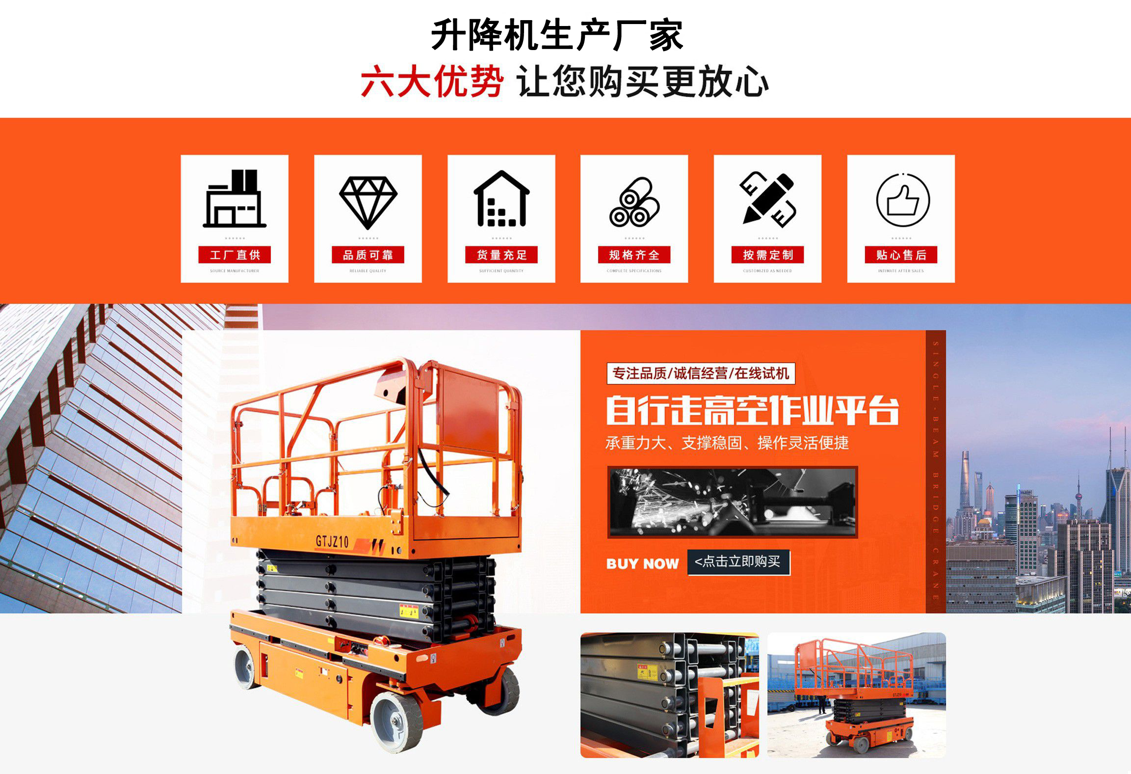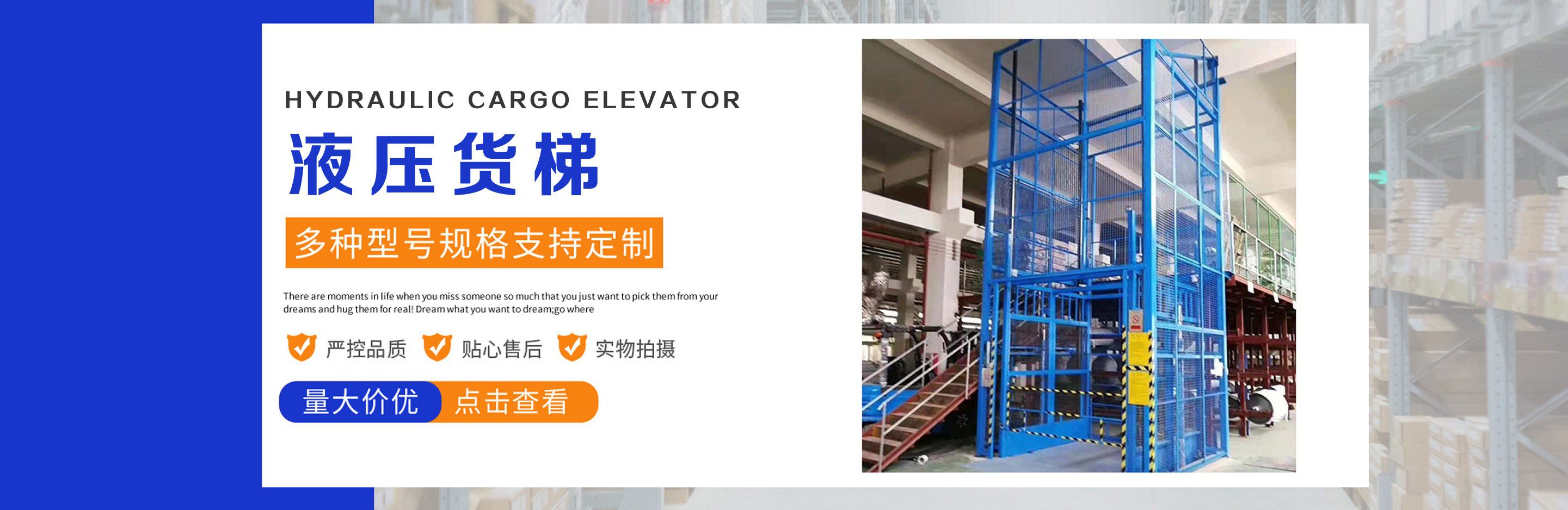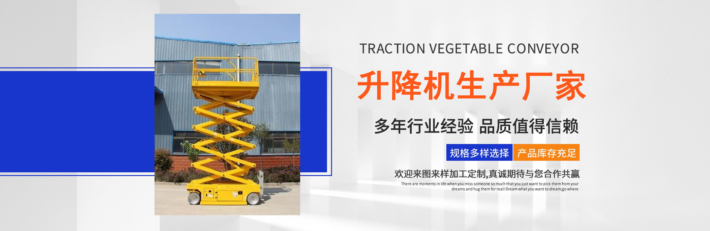 升降機(jī)生產(chǎn)廠家是專業(yè)從事升降平臺(tái),液壓貨梯,卸豬臺(tái),平板拖車,液壓提升機(jī),移動(dòng)式升降機(jī),升降平臺(tái)車,高空作業(yè)設(shè)備,貨梯廠家,液壓登車橋等升降機(jī)械產(chǎn)品制造十余年,服務(wù)過各大國內(nèi)外企業(yè)?! ∽怨緞?chuàng)立以來,經(jīng)過長期對(duì)液壓升降臺(tái)的研制和探索,積累了豐富的專業(yè)制造技術(shù)和寶貴經(jīng)驗(yàn)。憑借豐富的專業(yè)技術(shù)及不斷開拓創(chuàng)新的精神,現(xiàn)已成為專業(yè)于升降機(jī)械的公司?! ¢L期以來,憑借公司不斷的壯大及對(duì)液壓技術(shù)的不斷改進(jìn)和探索。能根據(jù)客戶不同的要求設(shè)計(jì)一套合理、完善的方案供客戶參考?,F(xiàn)有產(chǎn)品:升降平臺(tái),液壓貨梯,卸豬臺(tái),平板拖車,液壓提升機(jī),移動(dòng)式升降機(jī),升降平臺(tái)車,高空作業(yè)設(shè)備,貨梯廠家,液壓登車橋等。本產(chǎn)品在各類工礦企業(yè)、港口物流以及其它領(lǐng)域均發(fā)揮著重要的作用。始終以“以信譽(yù)求生存、以技術(shù)求發(fā)展”為本廠的經(jīng)營理念。只要你選購我廠的產(chǎn)品,無論你身在何方都能得到我們迅捷優(yōu)良的服務(wù)?! 」咀猿闪⒁呀?jīng)來本著"團(tuán)結(jié)、求實(shí)、創(chuàng)新、互贏"的理念,以先進(jìn)的技術(shù)和服務(wù),為客戶建造滿意的產(chǎn)品。幾年來受到廣大客戶的好評(píng)。...